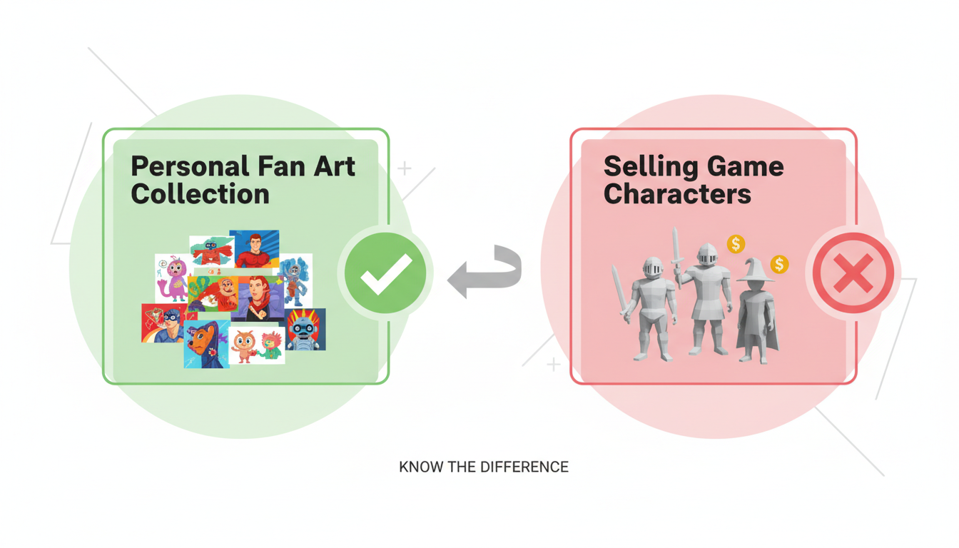Never Sell Game Content: Video game characters, logos, and branded elements are protected intellectual property. Creating them for personal display is fan appreciation, but selling them is illegal and harms game developers.