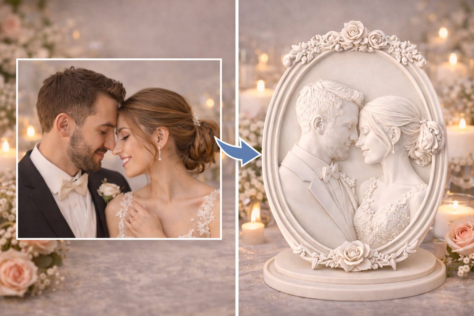 Image to 3D conversion allows you to turn photographs, illustrations, or drawings into physical wedding decor. This approach is ideal when you have existing artwork, meaningful photos, or specific visual references.