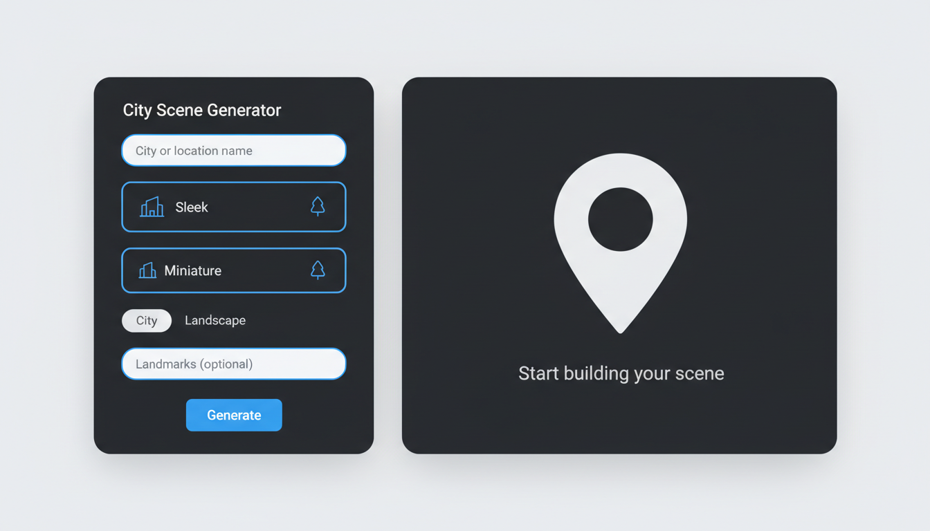 Text to 3D: Type any city, town, or geographic location. The AI generates an original stylized map image and then converts it into a 3D model. Perfect when you want a complete AI-generated diorama of a place.