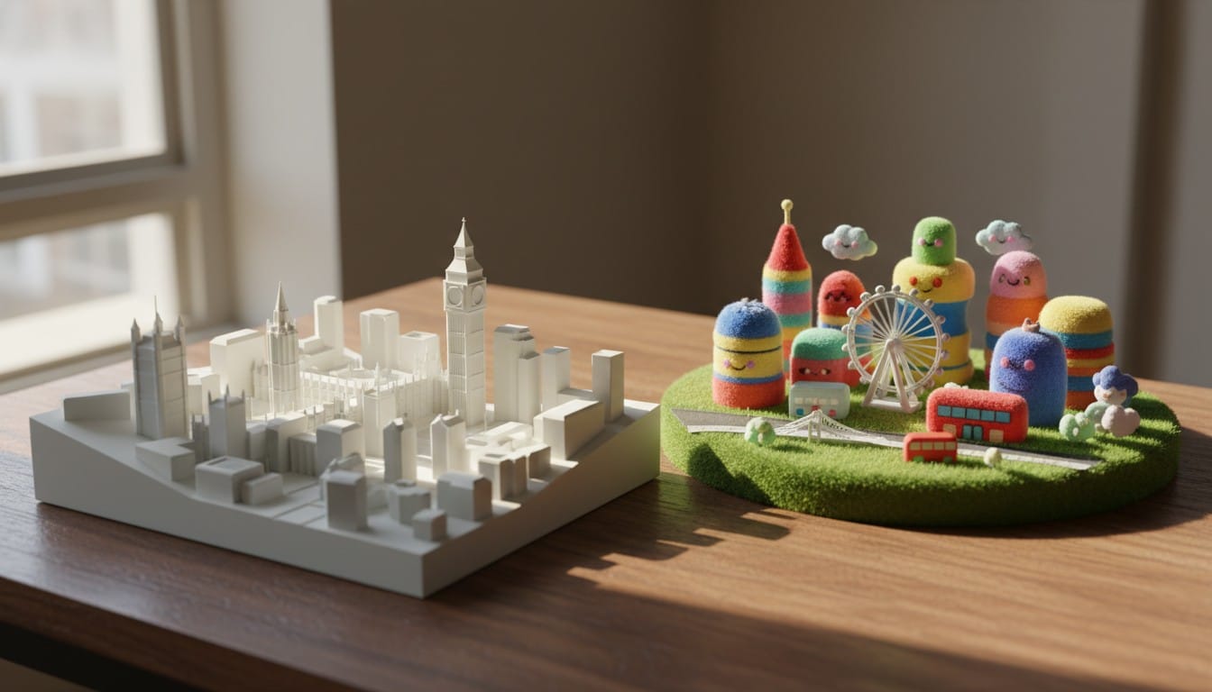 | Styles | Sleek maquette + Miniature diorama | Raw terrain heightmap |