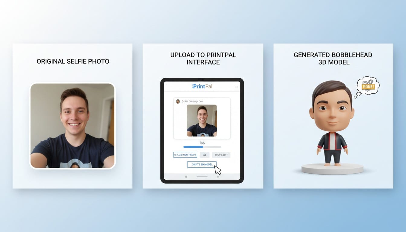 Upload to PrintPal: Use PrintPal's image to 3D generator. Upload your photo and specify "bobblehead style" or "caricature figure with oversized head" in your generation settings.