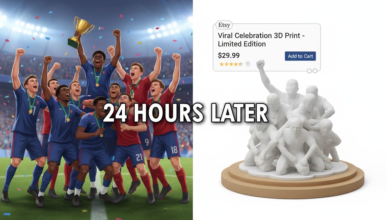 The Opportunity: Screenshot the celebration from highlight videos. Generate 3D models. List figurines on Etsy, eBay, or your own store within hours.