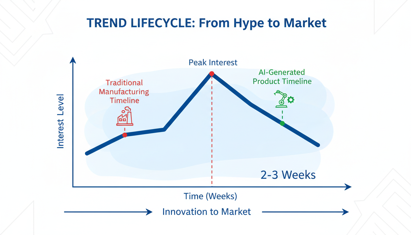 The Trend Lifecycle Problem: Viral moments peak fast and fade faster. A celebration, meme, or cultural moment might trend for one to two weeks maximum. Traditional manufacturing cannot capitalize on this window.