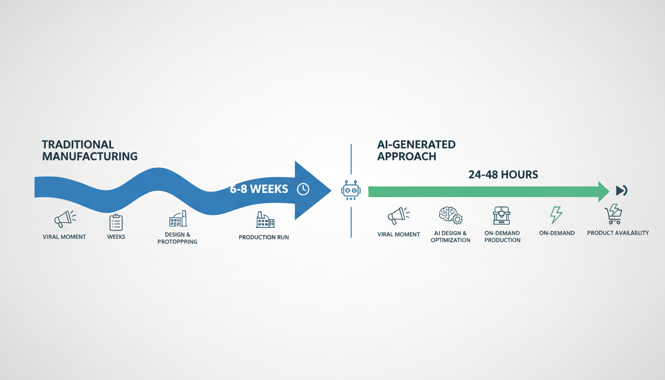 Traditional product development takes weeks or months. Design, prototyping, manufacturing, and shipping create massive delays. By the time conventional manufacturers react to trends, the moment has passed and demand has evaporated.