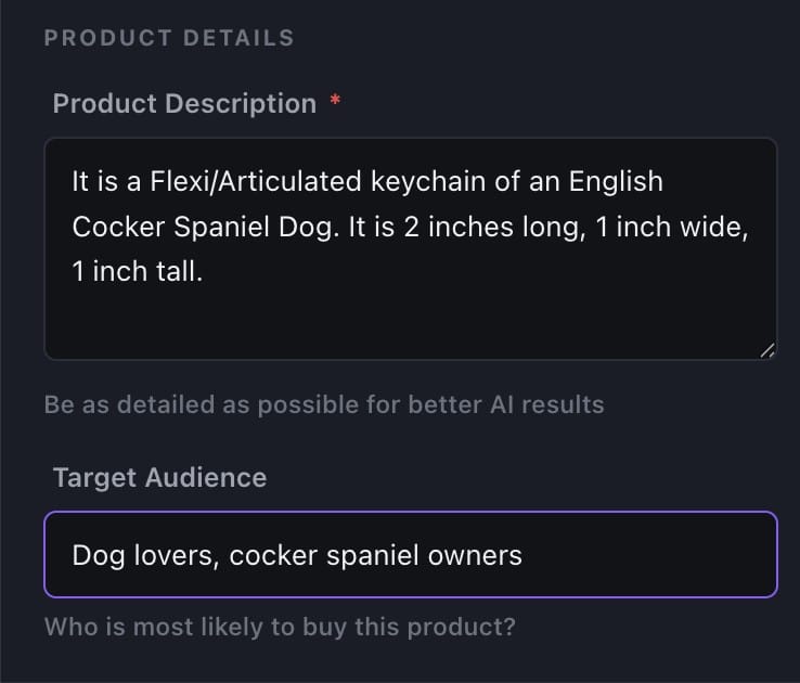 Fill in three fields:Product Description - Tell the AI what this item is. Be specific. Include the material, size, colors, and what makes it unique. For example: "A 4-inch articulated dragon printed in silk rainbow PLA. All joints move and it prints in place with no assembly required."Target Audience - Who are you selling to? Examples: "tabletop gamers," "desk toy collectors," "gifts for kids," "fidget toy buyers." The more specific you are, the better the AI tailors the listing language and keywords. Target Platform - Select Etsy, Facebook Marketplace, Amazon, or General. Each platform has different SEO rules and character limits. The AI adjusts the output format accordingly.