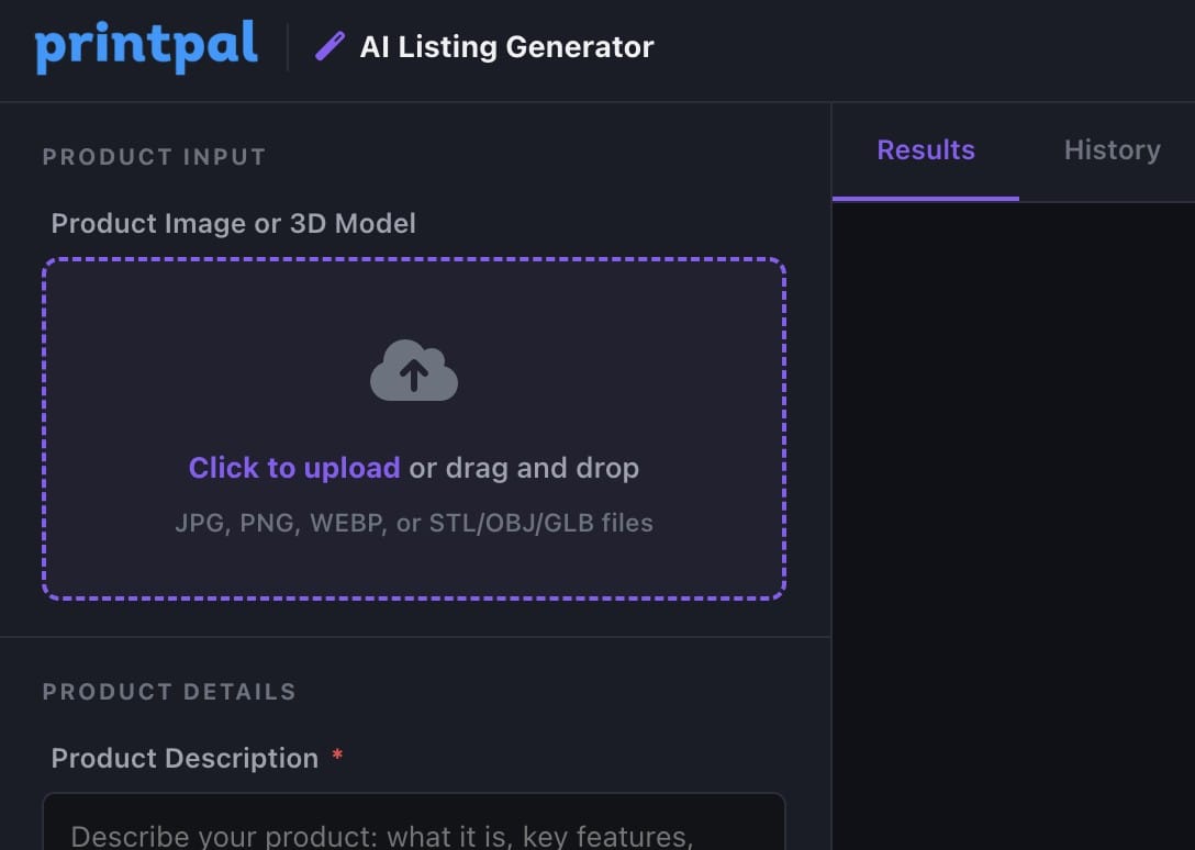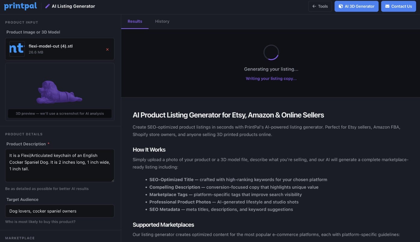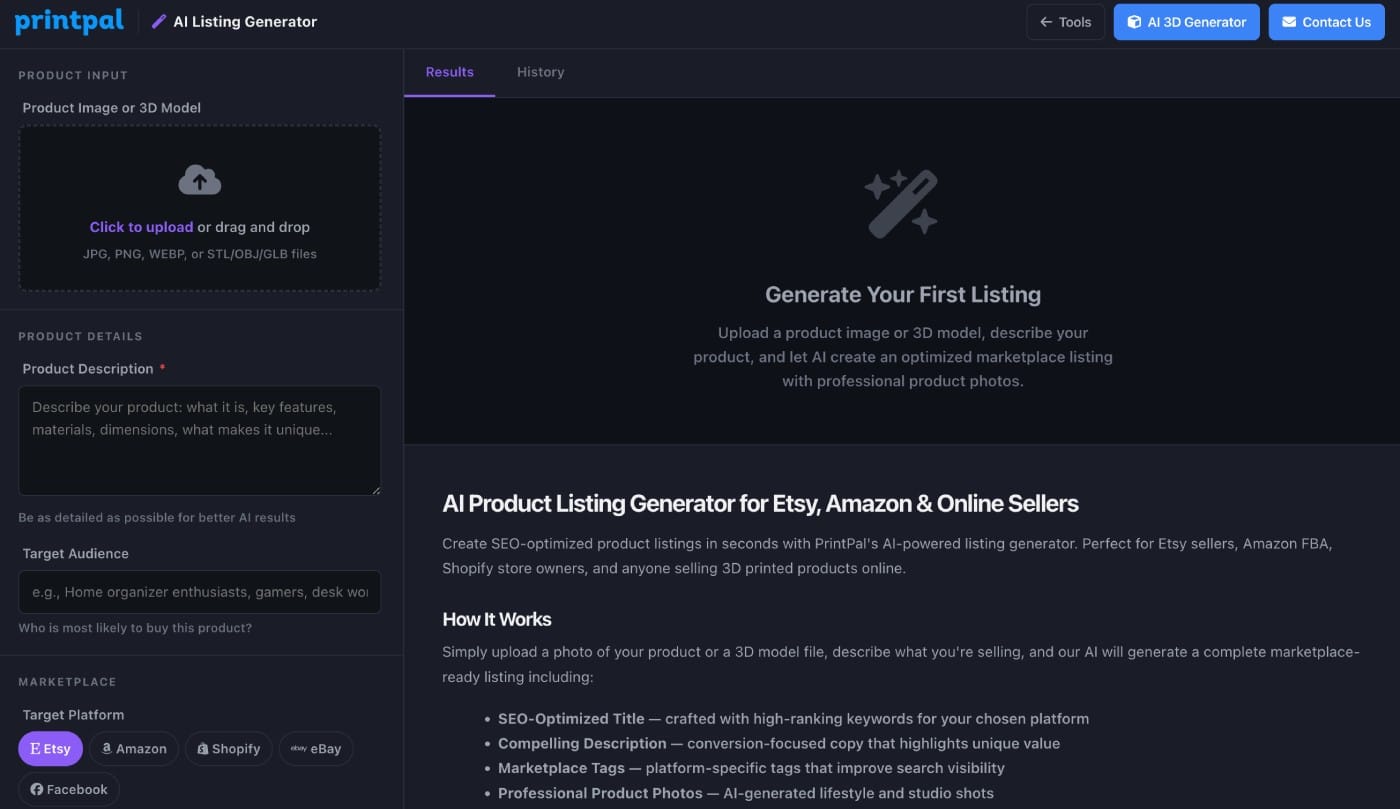 PrintPal's AI Product Listing Generator handles all of it in a single step. You give it a photo or 3D model, a short description, and your target audience. It gives you back a complete, SEO-optimized listing and a set of professional product photos. Here is exactly how to use it.