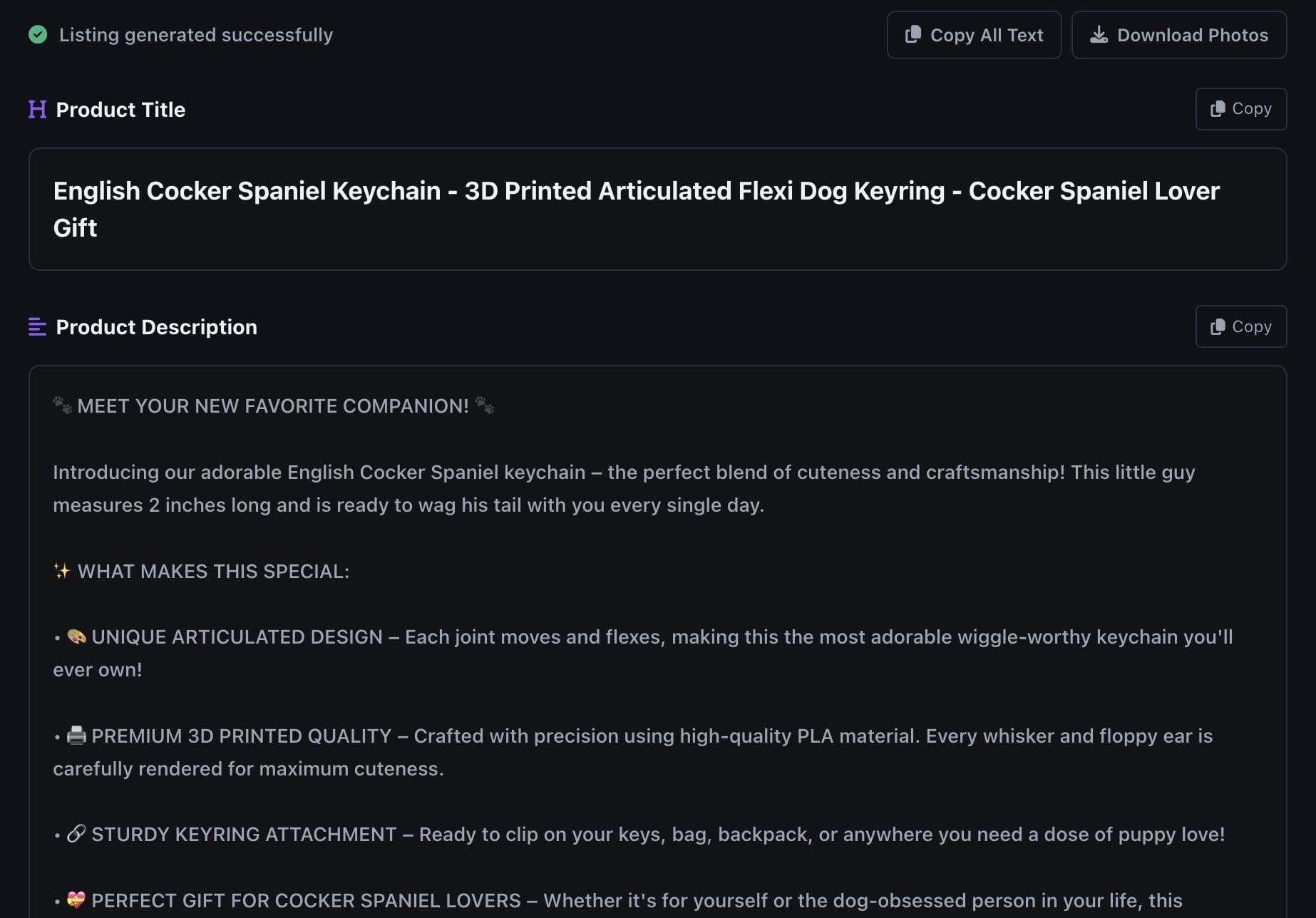 Once generation is complete, you get a full listing ready to paste into Etsy: