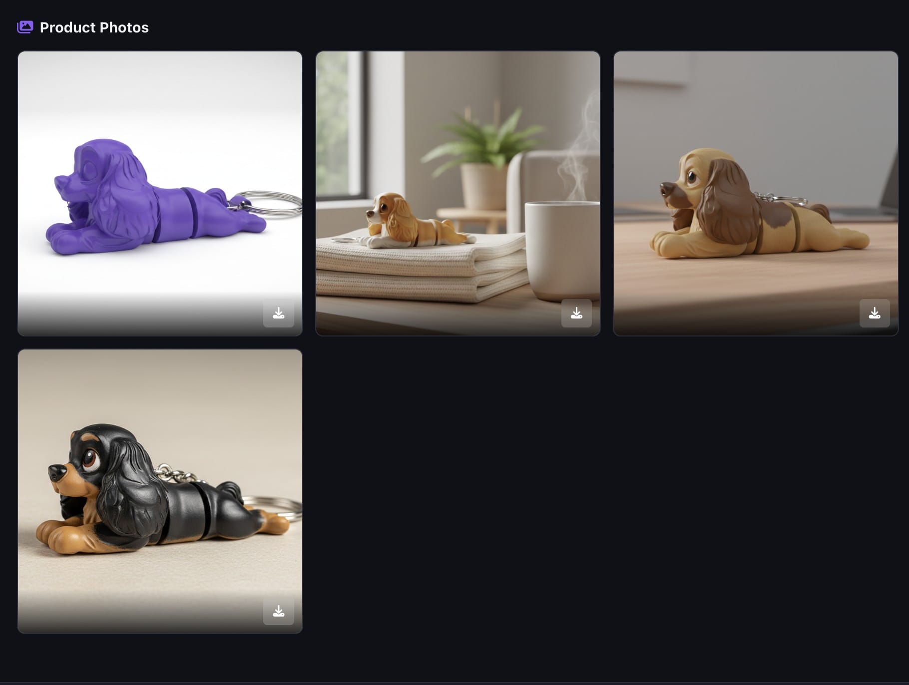 Below the text results, you will see your AI-generated product photos. Each one shows your product in a different professional setting with clean lighting and neutral backgrounds. Click any image to view it full size. Download the ones you want and upload them to your Etsy listing. These are not mockups or templates. The AI generates unique photos based on your actual product image, so every listing gets original visuals.