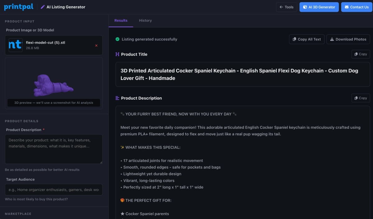 This is the one we're most excited about. Upload a photo of your 3D print (or a 3D model file), tell it what it is and who it's for, and the AI generates: