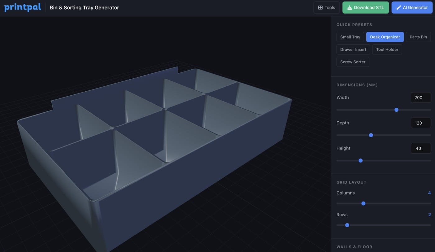Design custom storage bins with adjustable dimensions, wall thickness, corner radius, dividers, and more. Preview your bin in real-time 3D, then export as STL. Perfect for organizing your workspace, drawers, or selling custom organizers.