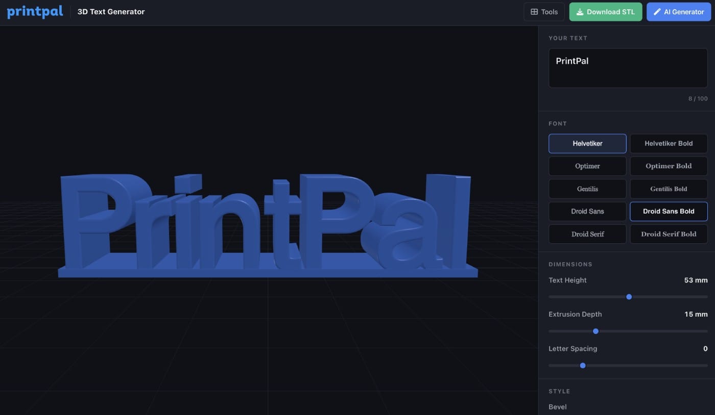 Type any text, choose your font, and generate an extruded 3D text model. Adjust size, depth, and export as STL. Great for custom nameplates, signs, cake toppers, and personalized gifts.