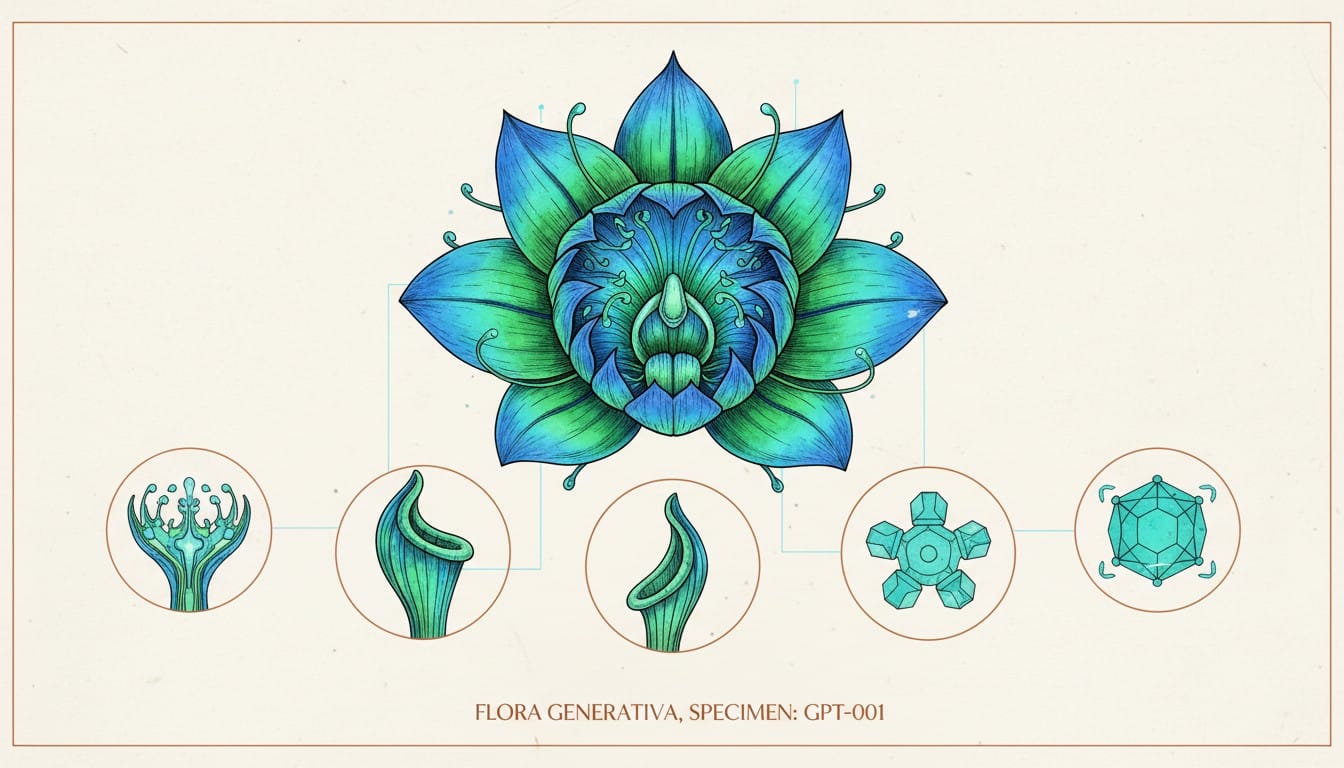 Example: "Botanical specimen photography of a decorative flower arrangement, scientific illustration style, multiple angles, labeled detail, museum quality"