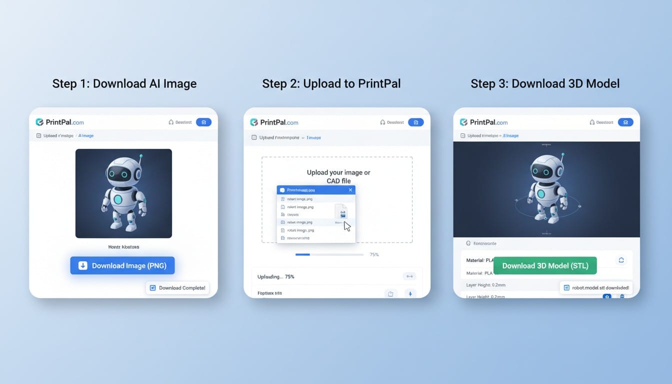 Step 2: Convert with PrintPal: Upload your ChatGPT-generated image to PrintPal's image to 3D generator. The AI analyzes the image and creates a printable 3D model automatically.