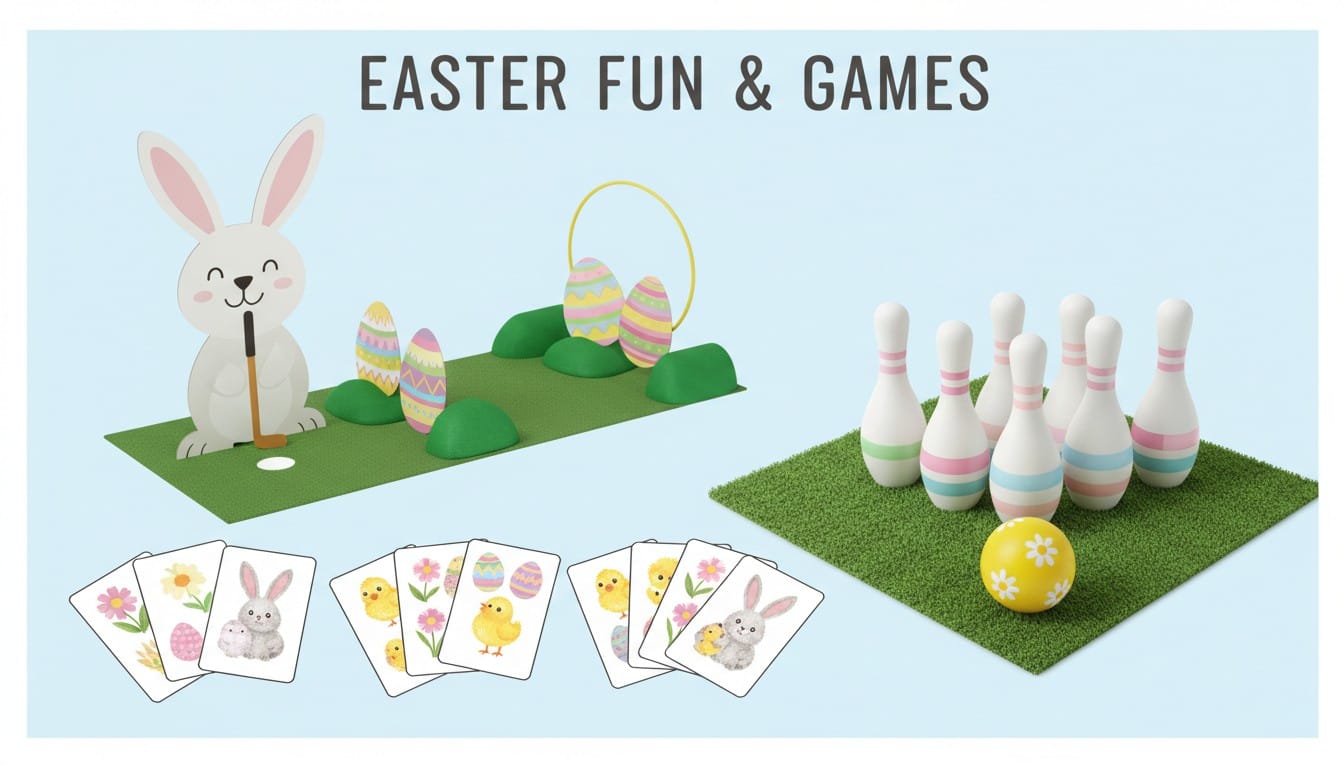 Bowling Games: Print bunny-shaped bowling pins with plastic eggs as bowling balls. Simple setup for indoor or outdoor Easter entertainment.