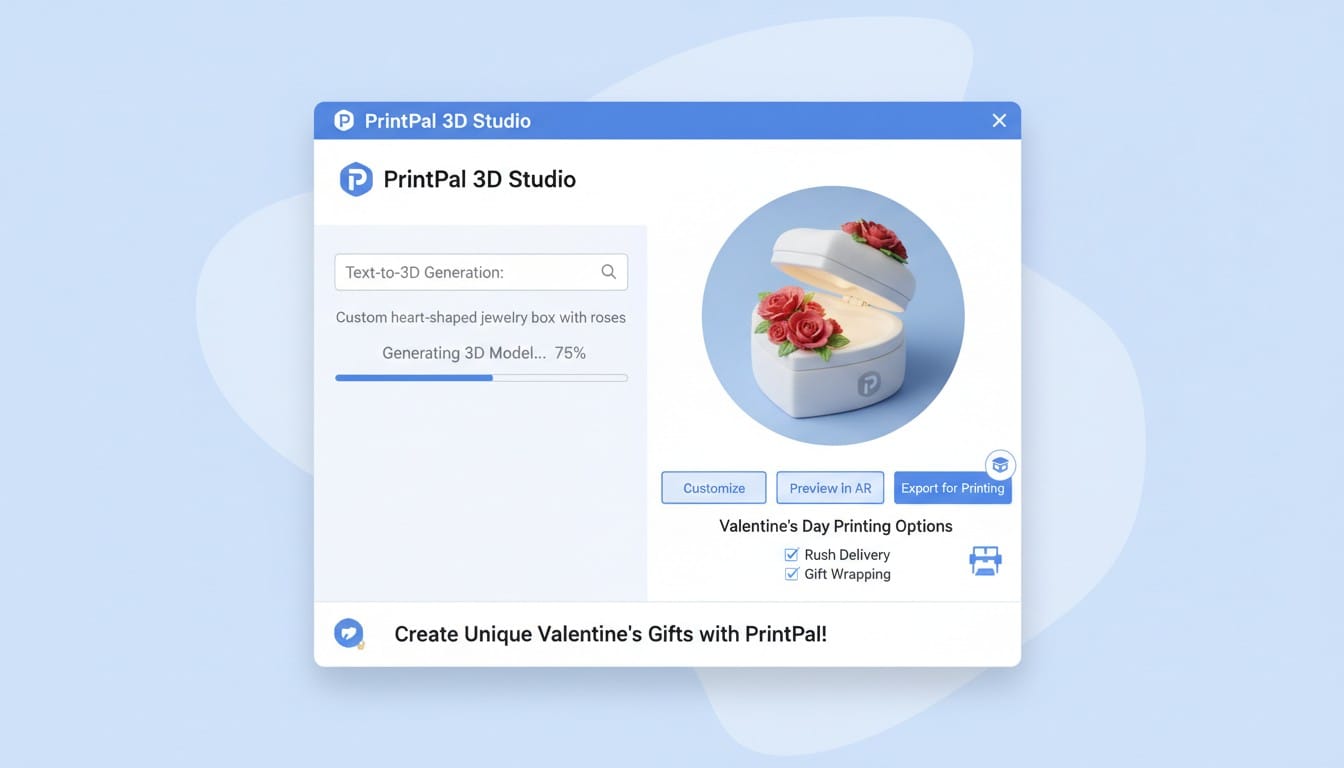 Valentine's Day deserves gifts that show genuine thought and creativity beyond generic store-bought options. 3D printing enables personalized expressions of love with custom designs, practical gifts, and romantic decorations that mass-produced items cannot match. While numerous pre-made Valentine models exist across 3D printing communities, the most meaningful gifts often require custom designs tailored to your relationship. PrintPal's AI-powered generator creates unique Valentine's Day models from text descriptions or photos, letting you design personalized gifts that perfectly capture your feelings. This guide explores the top Valentine's Day 3D print categories and shows you how to create custom designs when pre-made options do not quite express what you want to say.