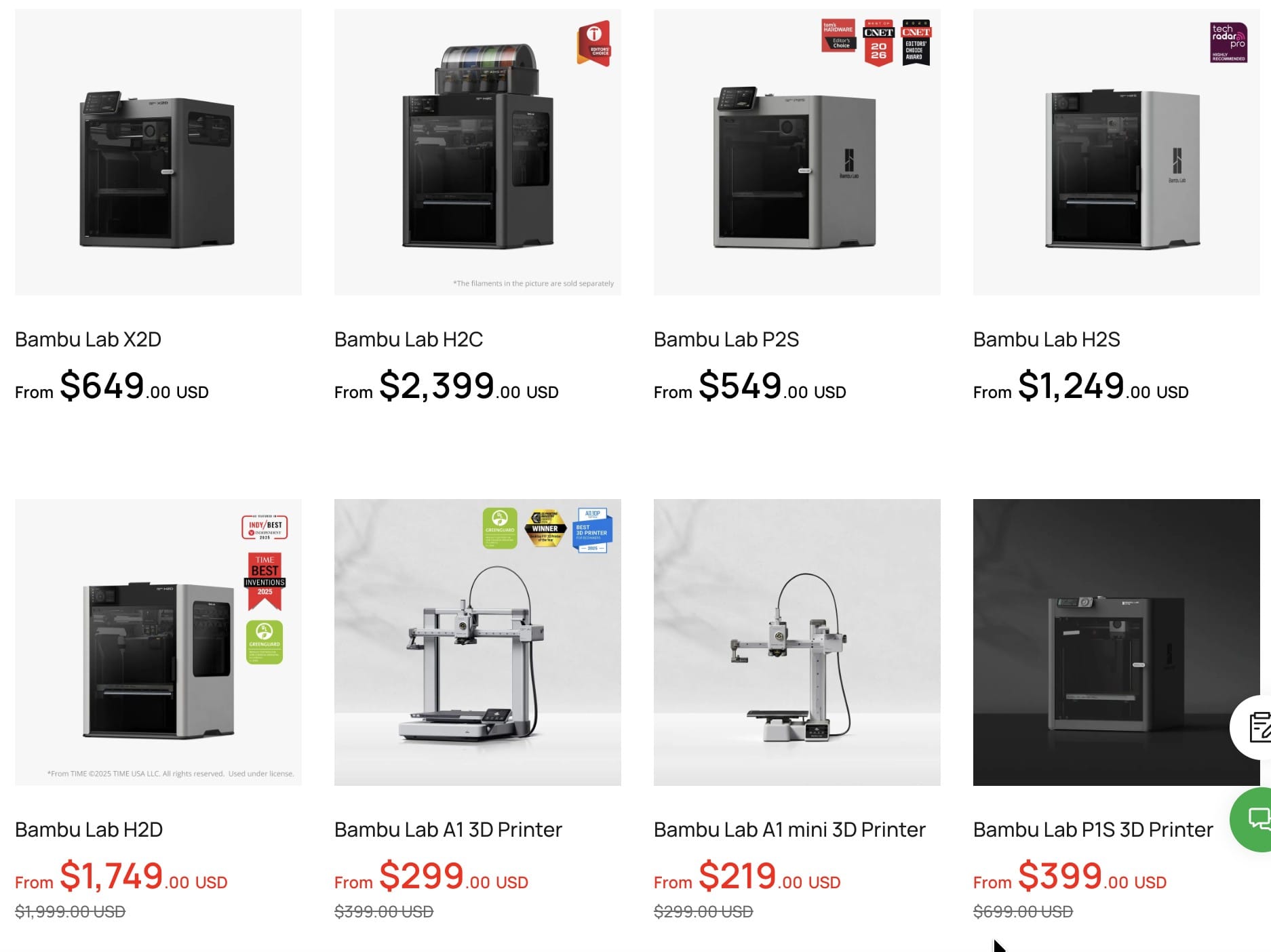 - H Series (H2S, H2D, H2C): large format, multi-material, laser and cutter optional