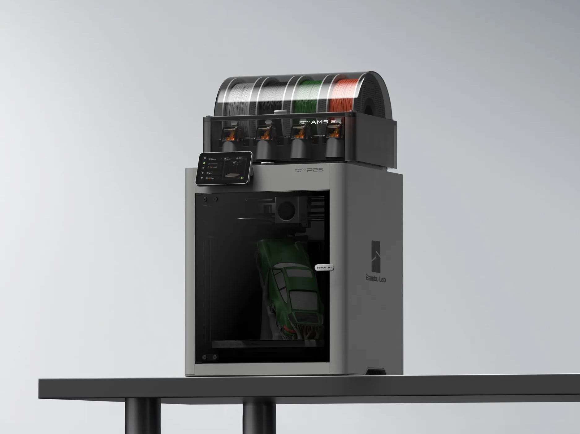 Released late 2025, the P2S keeps the P1S formula and adds a 5-inch color touchscreen, AI-powered error detection (spaghetti, nozzle clumping, purge jams), a 50C actively regulated chamber, 300C nozzle, 70 percent stronger extruder, and quieter operation. Build volume is the same. It works with the AMS 2 Pro, which also dries filament while it prints.